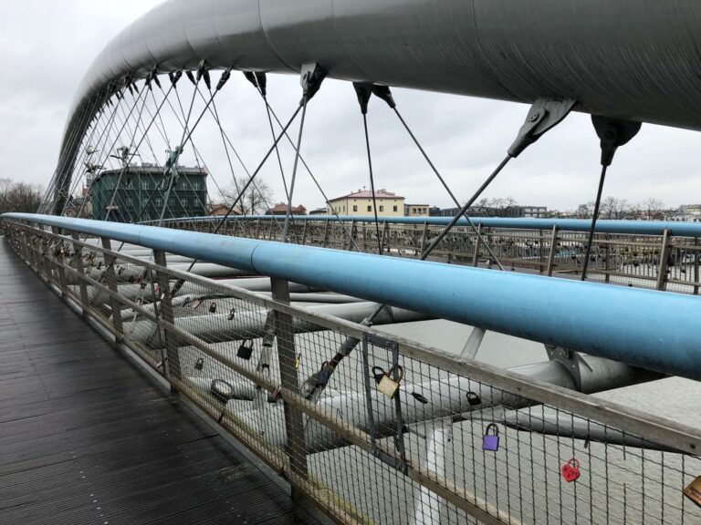 C’est l’un de ces ponts où les amoureux accrochent des cadenas en signe de souvenir — une tradition que l’on retrouve dans de nombreuses villes européennes. Ce pont relie les quartiers de Kazimierz (ancien quartier juif) et Podgórze (ancien ghetto). Ouvert en 2010, il mesure 130 mètres de long et est surnommé par certains le « pont de l’amour ». Il est exclusivement réservé aux piétons et aux cyclistes.